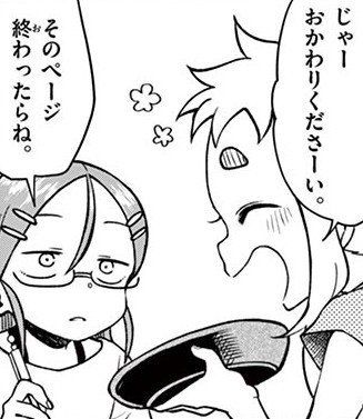 Manga panel from 恋に恋するユカリちゃん showing example of Get me some more cookies with おかわり.