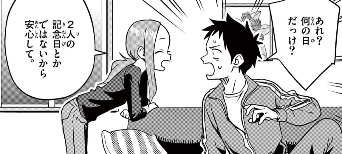 After returning home from work, Nishikata is ready to sit back and relax for a bit. Takagi leans over and asks Nishikata if he knows what day it is.