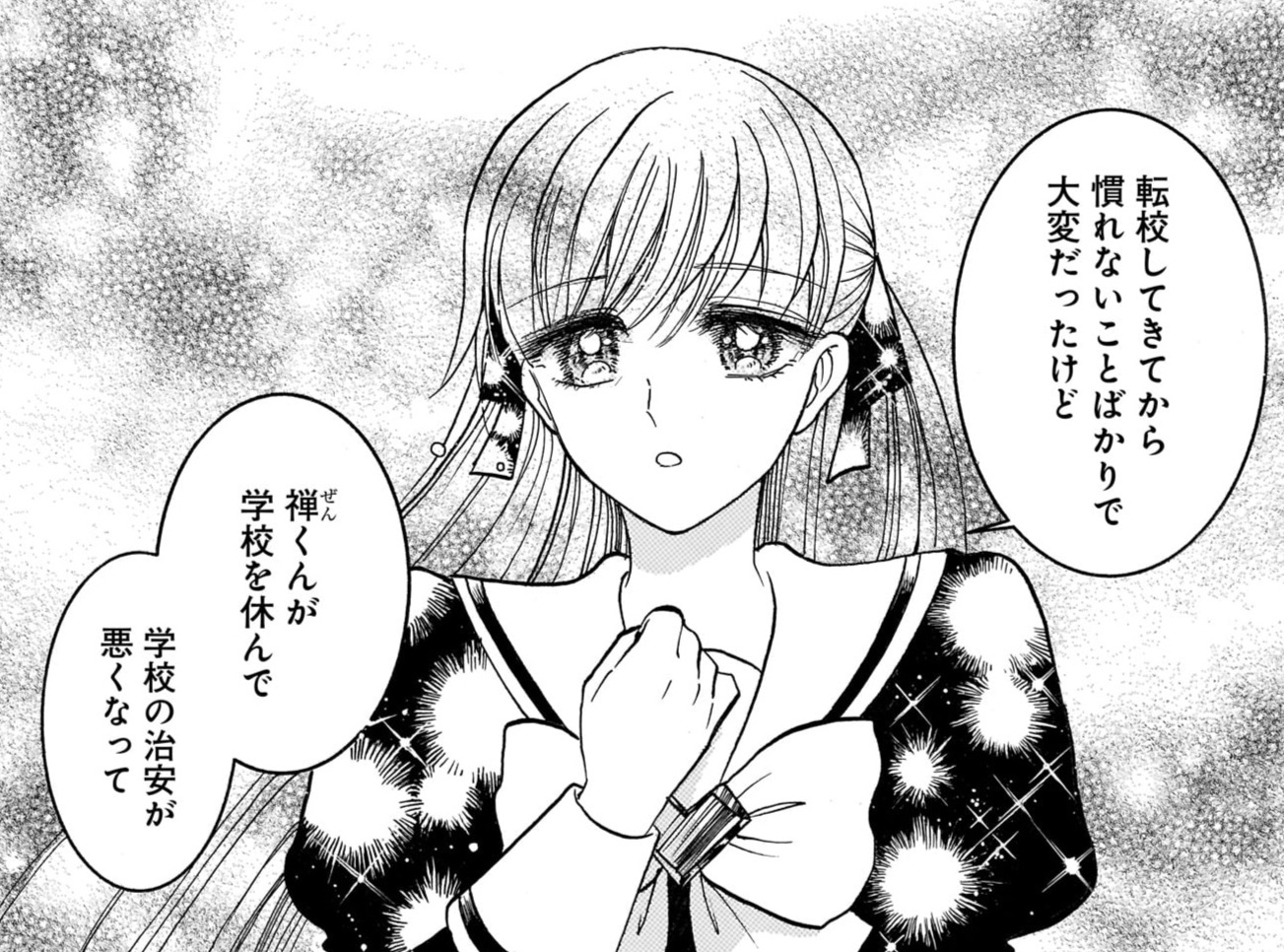 - 「転校してきてから慣れないことばかりで大変だったけど禅くんが学校を休んで学校の治安が悪くなって」