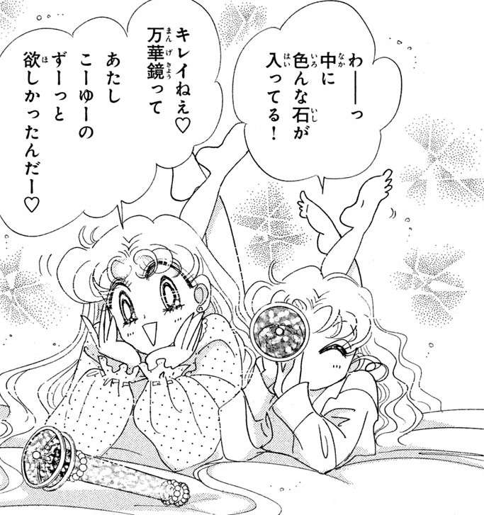 Usagi and Chibiusa look at the kaleidoscopes Mamoru bought them at the carnival.