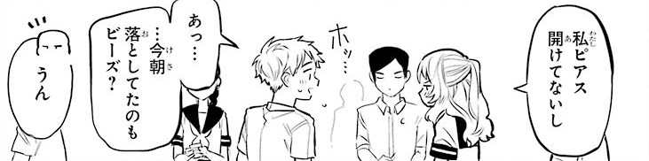 Komura sees Mie pick up an item she dropped and he wonders if it’s an earring. He fails to get a look at whether Mie’s ears are pierced. During class later, Mie shows Komura the item held up to her ear calling it a 「ピアス」. She then reveals it’s just a bead.