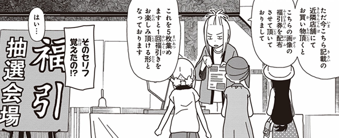 「ただ(いま)こちら記載(きさい)近隣(きんりん)店舗(てんぽ)にてお()(もの)(いただ)くとこちらの画像(がぞう)福引券(ふくびきけん)配布(はいふ)させて(いただ)いておりまして」